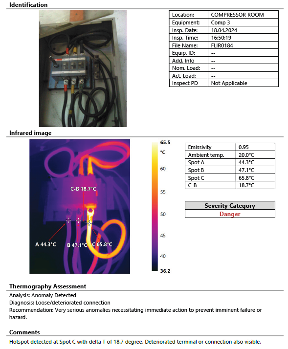 - Issue Highlighted: Hotspot at Spot C with a temperature of 65.8°C and a Delta T of 18.7°C, clearly indicating a critical loose or deteriorated connection.